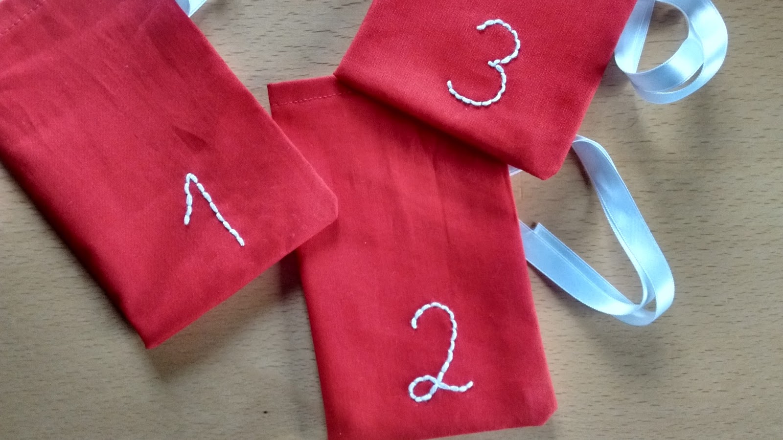 Die Säckchen an sich gingen sehr schnell zu nähen, da fand quasi eine Fließbandproduktion an meinem Schreibtisch statt. Was länger gedauert hat, war die Stickerei. Ihr könntet allerdings auch die Ziffern mit Textilfarbe aufmalen oder aufstempeln, das wäre eine schnellere Variante.